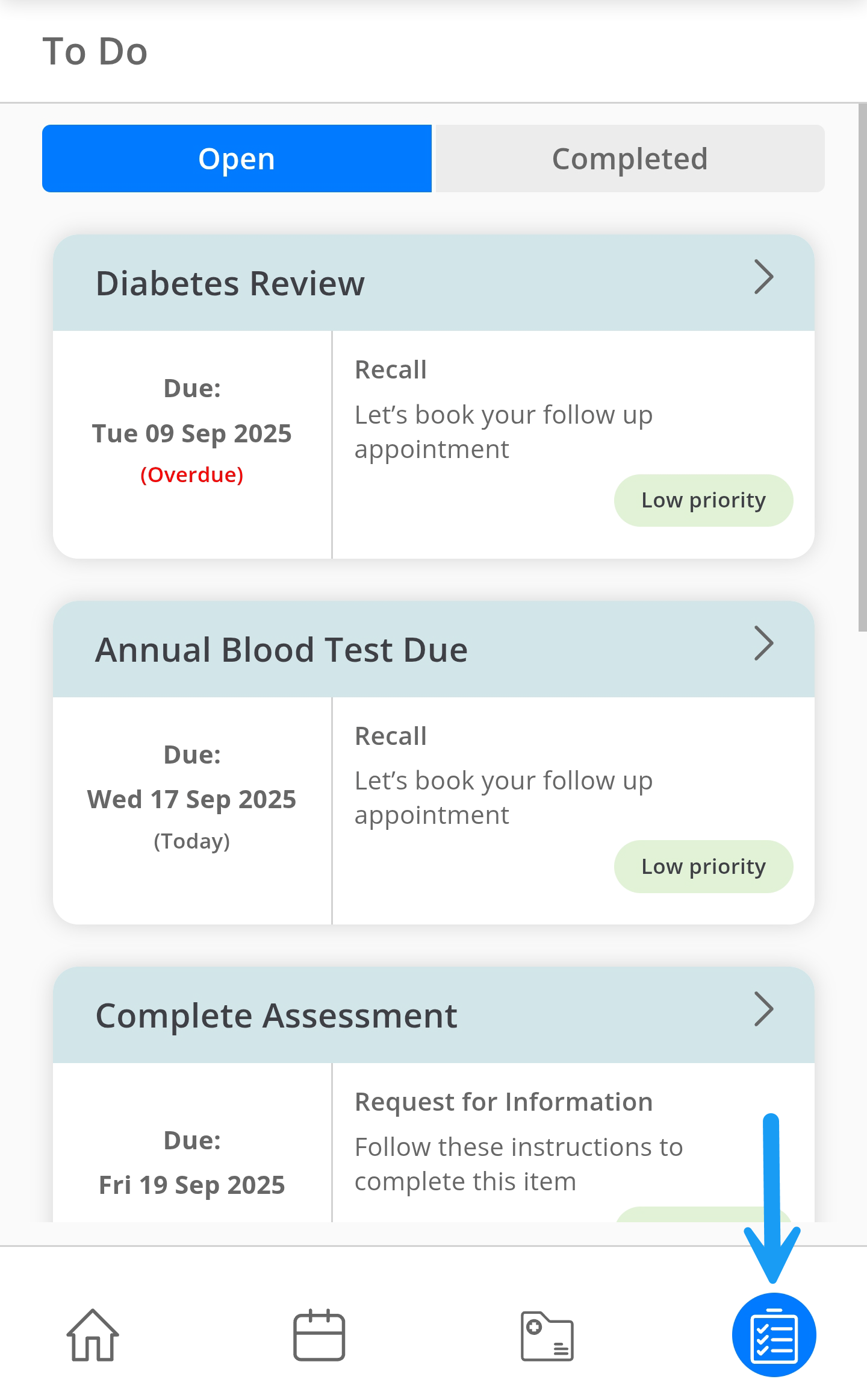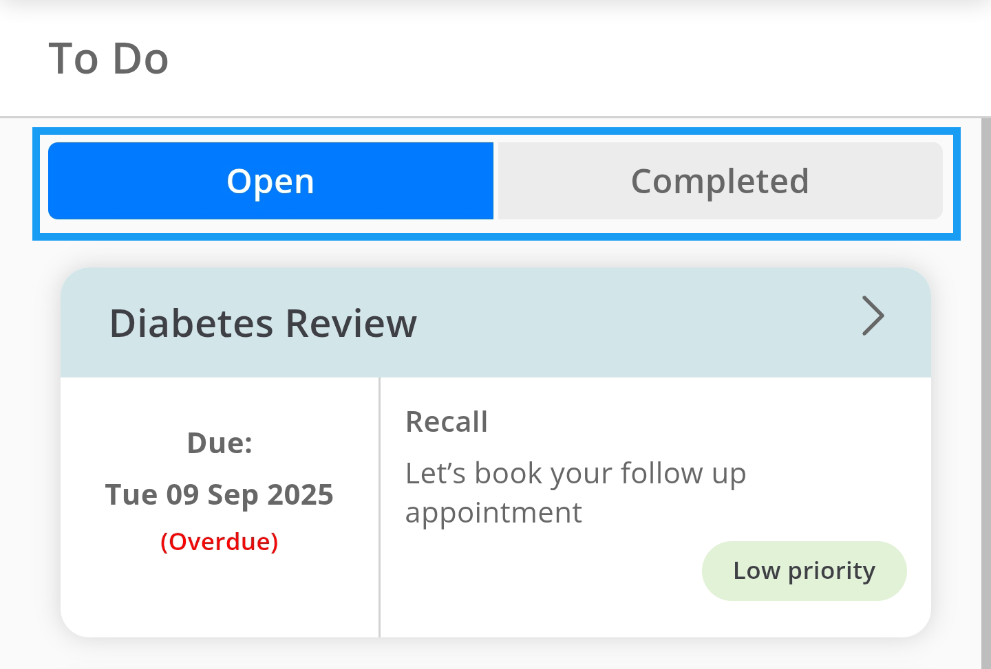 By using the To Do list, you can clearly see what’s outstanding, what you’ve already completed, and quickly let your provider know when you’ve finished an activity. This keeps your care team informed and helps ensure your appointments run smoothly.