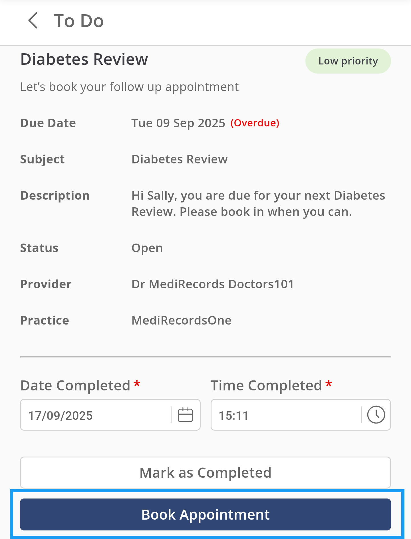 - Once your appointment has been completed, your To Do will also be marked as Complete automatically. You don't need to return to do this yourself.
