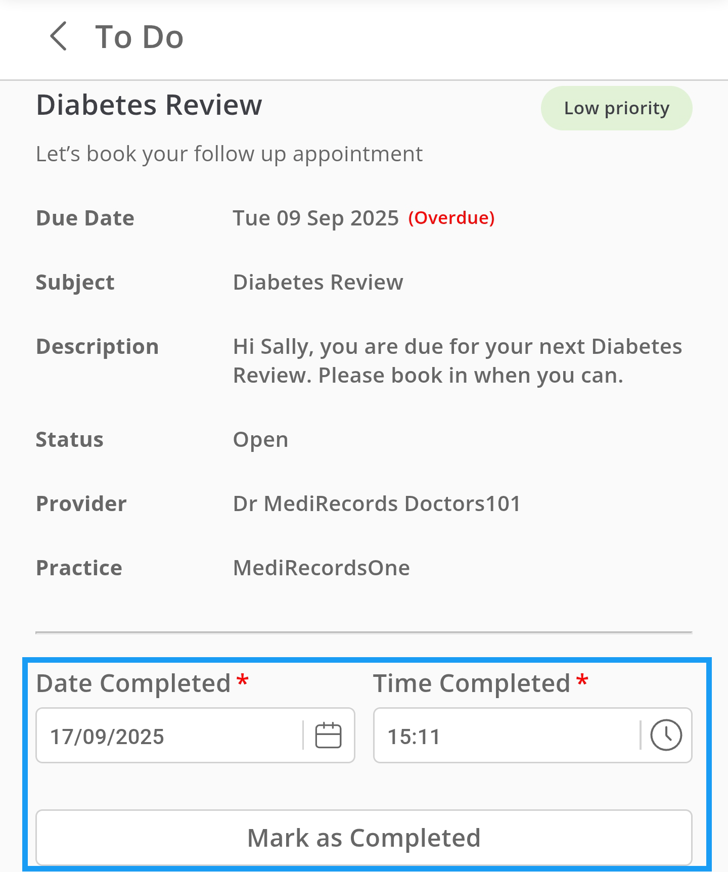 To let your provider know that you have completed the assigned To Do, you can mark a To Do as Complete. This will then update your provider's records also.