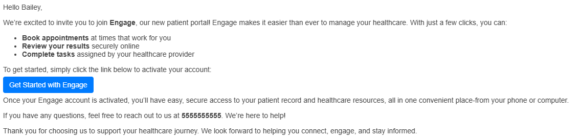 - Congratulations on your new Engage account! You're ready to start sharing information with your practice!