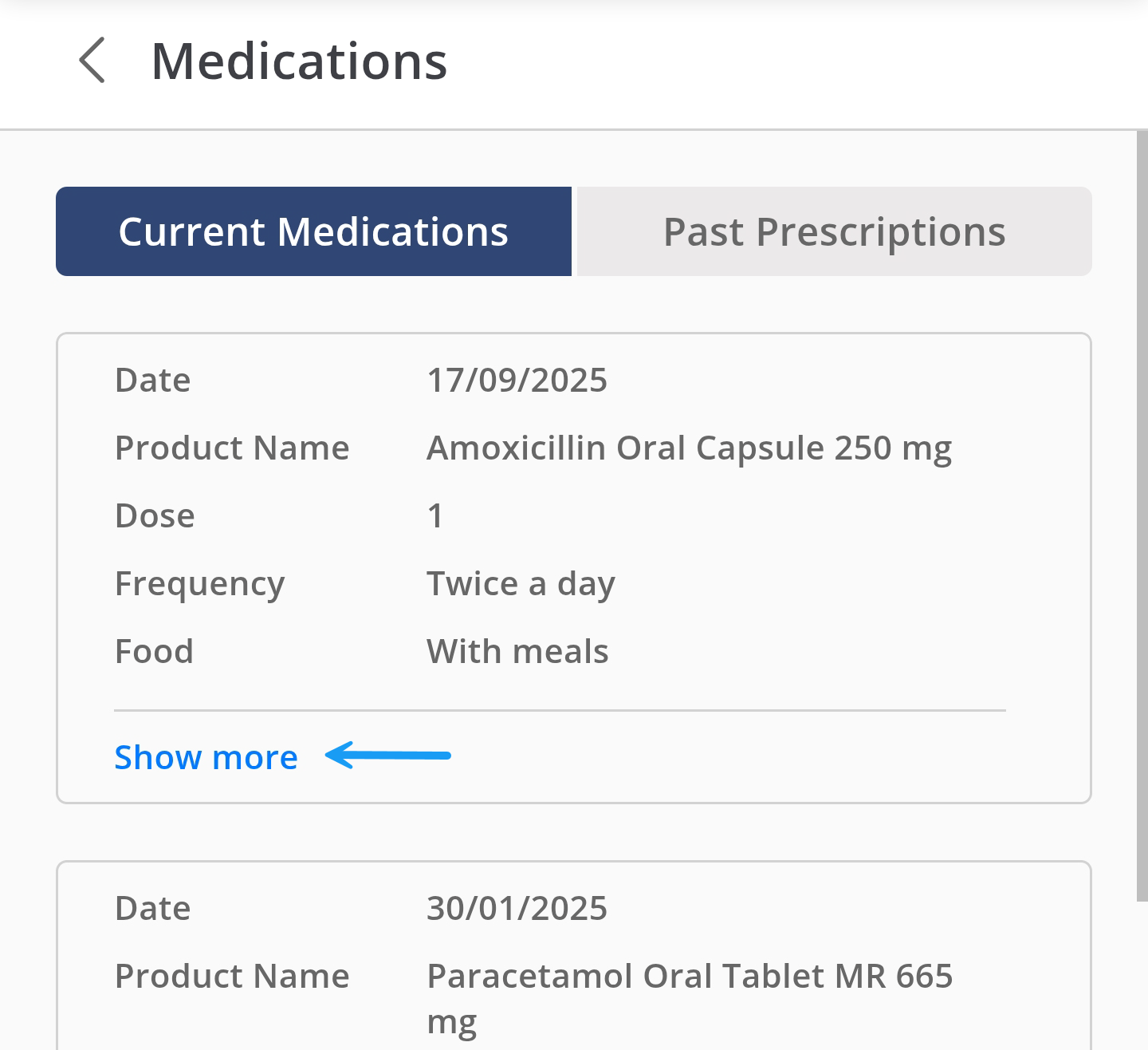 On Mobile or Tablet, tap on Show more under a Medication to see further information.