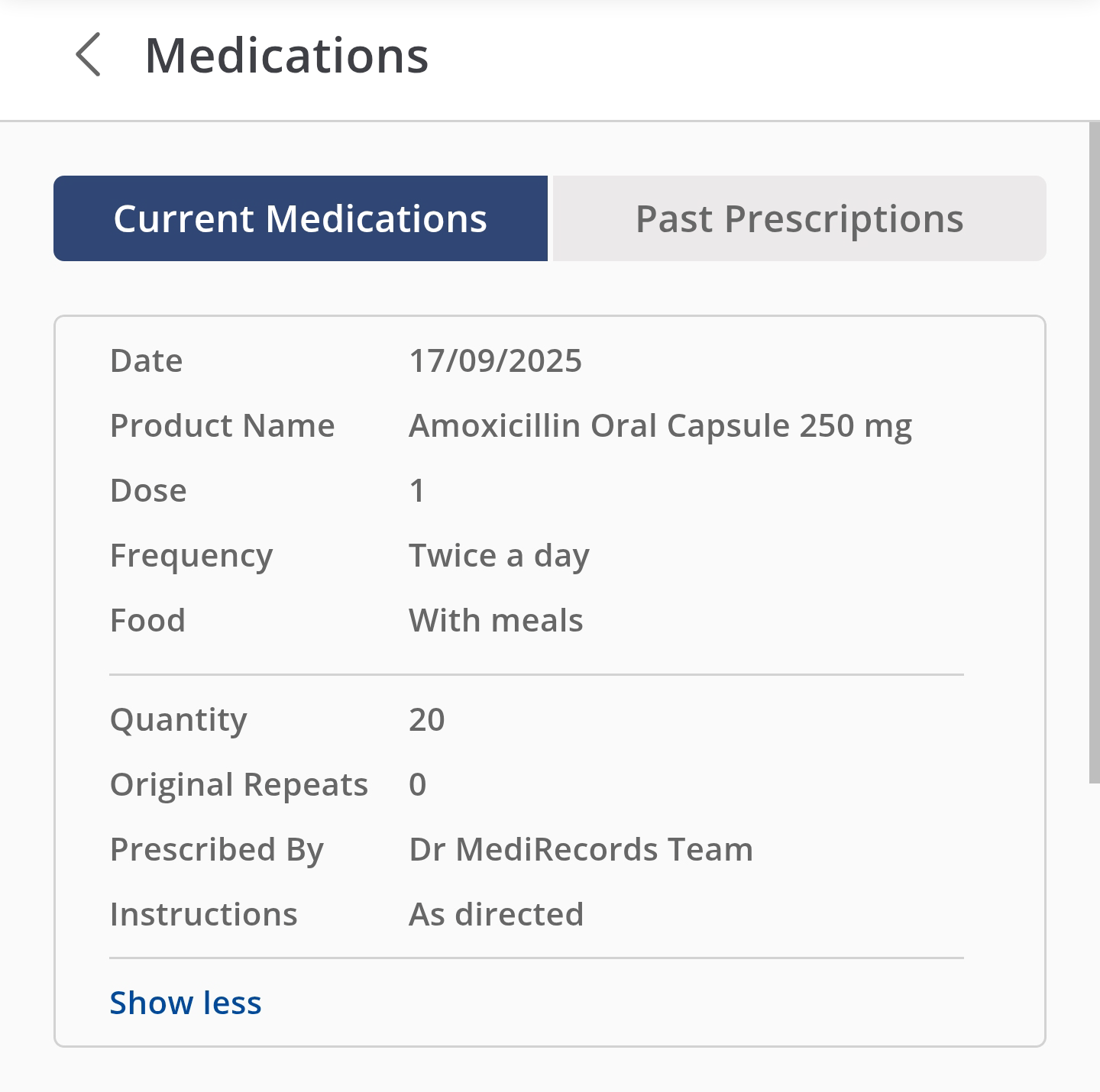 Prescription - if the prescription was created as an electronic prescription, then the hyperlink to your token will be displayed here. If you received a paper prescription, you won't see this information.